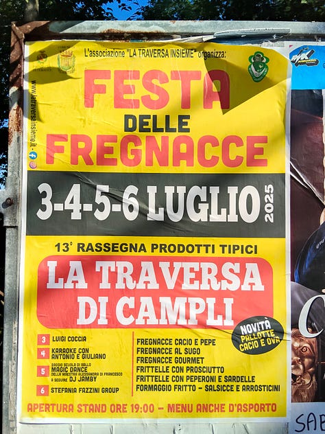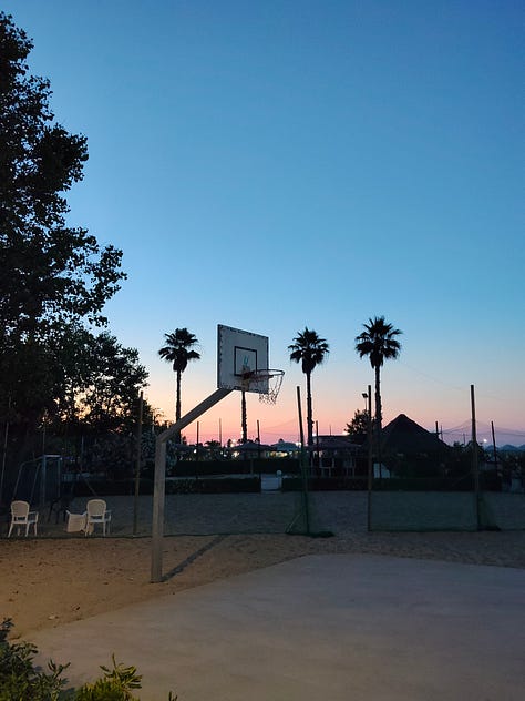 Una sera abbiamo preso le biciclette e, percorrendo la ciclabile che corre ininterrotta per decine di chilometri lungo la costa, siamo arrivati nel comune adiacente, Tortoreto. In quell’occasione abbiamo visitato il suo lido all’imbrunire, un’esperienza che mi è piaciuta tantissimo. Ma di Tortoreto abbiamo visto anche il centro storico. Lì ci siamo incontrati con Giulia (una lettrice di questa newsletter, ciao Giulia!) e la sua famiglia, e abbiamo assistito a una sfida di breakdance tra giovanissimi del posto, che è stata a un passo dal degenerare in rissa (per colpa dei genitori, si intende).