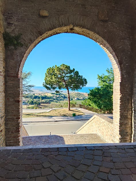 Un borgo simile a Tortoreto è Montepagano, frazione di Roseto degli Abruzzi. Vi abbiamo incontrato una manciata appena di turisti - come sempre non appena ci allontanavamo dalla costa - e invece a me è piaciuto molto, con i suoi vicoletti e la vista inconsueta che abbraccia nello stesso sguardo il mare e le colline.