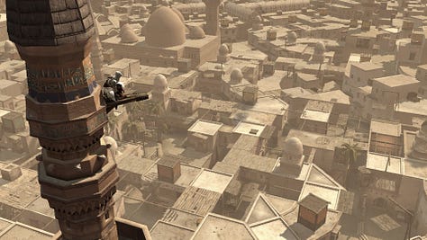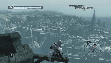 Se dovessi sintetizzare il mio pensiero su Assassin’s Creed (2007, Ubisoft Montreal)1, direi che è stata una grandissima esperienza immersiva, ma una mediocre esperienza videoludica. Le prime tre-quattro ore di gioco - su un totale di circa diciannove che mi sono occorse per arrivare alla fine - sono state grandiose e ben oltre le aspettative. L’inizio in medias res, poi un tutorial inserito organicamente all’interno della trama e a seguire un open world da percorrere a cavallo (che francamente non mi aspettavo): quando sono arrivato a Damasco - la prima delle tre grandi città del gioco - e ho cominciato ad affrontare le varie missioni, avevo gli occhi traboccanti di ammirazione.
